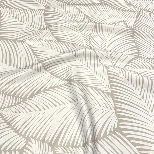This fabric is 100% polyester base with our "Tulum" palm leaves throughout the fabric with a white background.